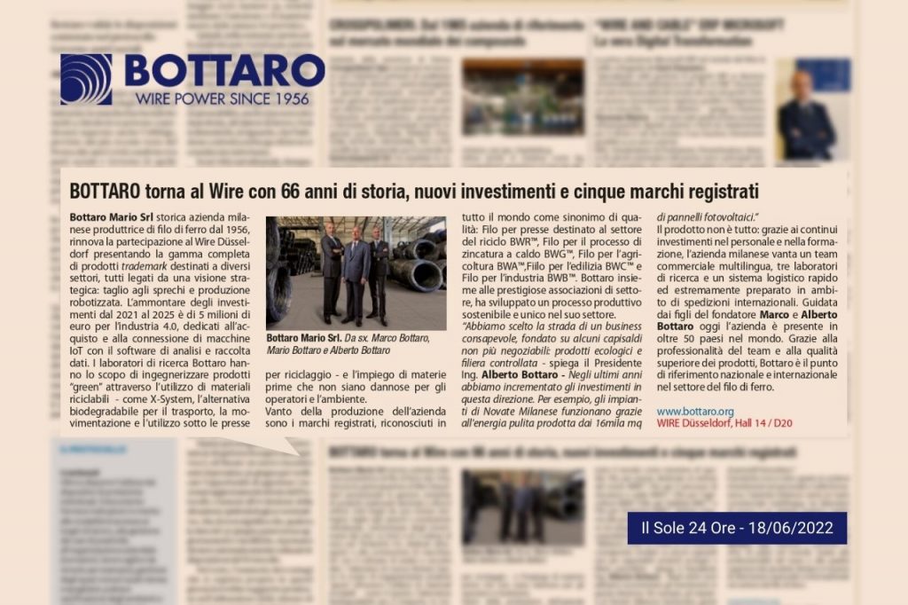 Por ocasião de sua participação na feira Wire & Tube em Düsseldorf, Il Sole 24 Ore escolheu contar a história de Bottaro, entre produção robótica, investimentos em energia limpa, cadeia de suprimentos verde e produtos trademark.